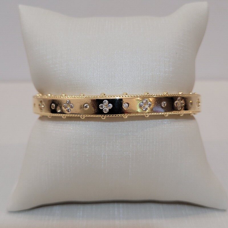 Bracelete liso com trevos cravejados, oferecendo um toque de brilho e charme. Elegante e confortável, ideal para uso diário ou ocasiões especiais.