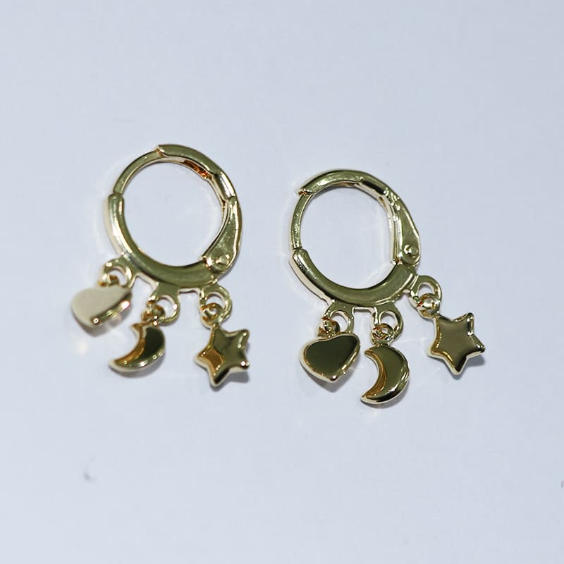 Brinco argolinha com pendentes de coração, lua e estrela para um visual encantador e cheio de estilo. Leve e confortável para uso diário, ideal para elevar qualquer look com um toque simbólico.