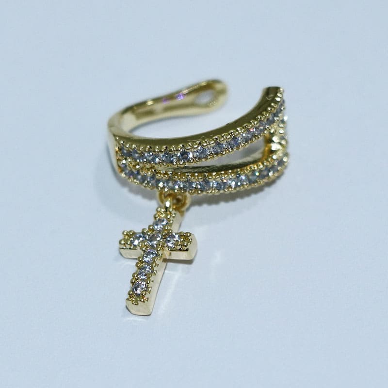 Brinco fake de cruz com zircônia para um visual elegante e espiritual. Leve e confortável, ideal para uso diário ou em ocasiões especiais.
