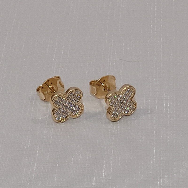 Brinco trevo cravejado com pedras brilhantes, símbolo de sorte e elegância. Leve e confortável, ideal para uso diário e ocasiões especiais, trazendo um toque de brilho ao visual.